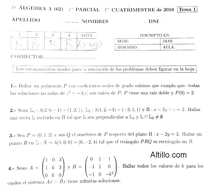 1º Parcial B  |  Algebra (2016)  |  CBC  |  UBA