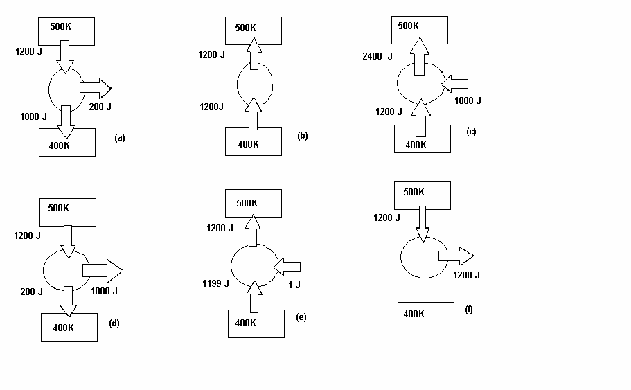 2. Los círculos de la figura representan máquinas que repiten su estado inicial cíclicamente y operan entre fuentes de calor cuyas temperaturas absolutas son las mostradas. Las flechas verticales indican intercambios de calor, y las horizontales, de trabajo. Indique cual es el único caso, entre los seis que se ofrecen, que corresponde a un proceso posible, porque no viola principios termodinámicos.