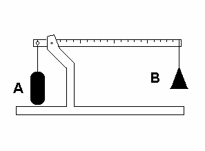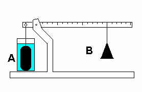 3. El volumen del cuerpo A es diez centímetros cúbicos, y la masa de la pesa B es de un gramo. La balanza se equilibra como indica la figura. Pero cuando se sumerge el cuerpo A en un liquido, se equilibra con el cuerpo B en la otra posición indicada a la derecha (note que esa pesa B ha sido desplazada 5 divisiones de la regla). Las divisiones de la regla son iguales, y equivalen a la distancia entre el punto de apoyo y el hilo del que cuelga el cuerpo A. ¿Cuánto vale la densidad del liquido? (la masa de A, la de la palanca y la ubicación de su centro de gravedad son datos innecesarios para resolver este ejercicio). (a) 0.3 g/cm3 ; (b) 0.4 g/cm3 ; (c) 0.5 g/cm3 ; (d) 0.6 g/cm3 ; (e) 0.7 g/cm3 ; (f) 0.8 g/cm3.