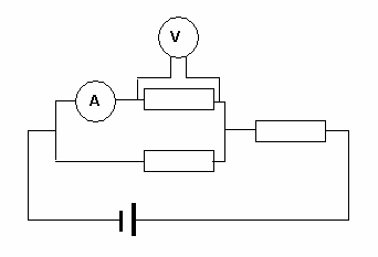6. En el circuito de la figura los tres resistores son de 40 ohms cada uno, y la batería, de 12 volts. La tensión y la corriente que indican esos instrumentos (que se consideran ideales) valen, respectivamente: (a) 3V y 150mA; (b) 4V y 100mA; (c) 12V y 300mA; (d) 6V y 450mA; (e) 6V y 450; (f) 4.5V y 150mA.