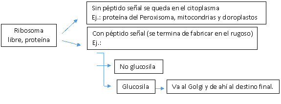 Partiendo de tres ribosomas cada uno va a fabricar un polipéptido con su péptido señal y van a pasar al interior del rugoso donde se entrelazan (forman la triple hélice) pero tienen los dominios globulares que permiten que no se forme colágeno dentro de la celular. Se produce también la hidroxilacion de prolinas y lisinas; la vitamina C funciona como coenzima, es la que permite la hidroxilacion. [Escarbuto es la enfermedad cuando no se consume vitamina C] La estructura de codominios globulares se llama PROCOLAGENO, va del rugoso al Golgi y en una vesícula se va al exterior donde se eliminan los dominios globulares y queda el protocolageno; el conjunto de estos sueltos forman las fibras de colágeno.