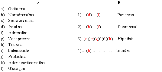 6) Coloque junto al número la o las letras que correspondan, relacionando las hormonas indicadas en la columna A, con las glándulas endocrinas citadas en la columna B.