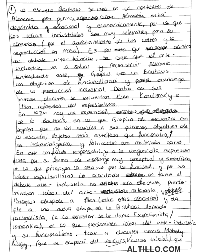 1 La Bauhaus se crea en el contexto de una Alemania post Primera Guerra Mundial, 1919 Walter Gropius junta para el cuerpo docente de su escuela diversos artistas que en este momento los ve necesarios para que Alemania pueda avanzar ya que formaba parte del grupo derrotado de la guerra, necesitaba reacomodarse y con esto abaratar y hacer más eficaz la industria y sus productos. Gropius, juntó a profesores como Itten y Jandinsky, artistas de un lado más expresionistas, que enseñan a los alumnos a tratar con diversos materiales, profundizando el entendimiento en un modo más artesanal,(Gropius junta talleres de artesanías con talleres de pintura) busca que entiendan cómo trabajar el material por medio de la exploración personal, desde su ensamblaje, y propuesta, sabiendo como son las técnicas para transformarlo en arte, la Bauhaus buscaba fortalecer a los jóvenes y ayudarlos en su desarrollo individual (En un principio), Ya que tras una exposición de la escuela en 1923 Gropius se dió cuenta de que los resultados de los proyectos de sus alumnos eran demasiado experimentales y en algunos casos poco prácticos y costosos. Esto produce un quiebre que lleva a el replanteo del cuerpo docente del momento, el aire expresionista que trae esta primer etapa de la Bauhaus no cumple con los objetivos de Alemania y es por esta razón que se buscan artistas como el Húngaro Monholy-Nagy que trae un aire constructivista renovador y estructurador a la escuela. Pasan a tener un enfoque más dirigido al Arte-Industria, nace la "Tipo-foto", y poco a poco se deja de tener este enfoque tan artesanal y pasan a tener uno más racionalista y funcionalista, buscando fortalecer a Alemania y ayudar en su reconstrucción.